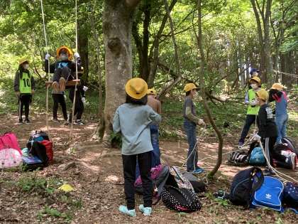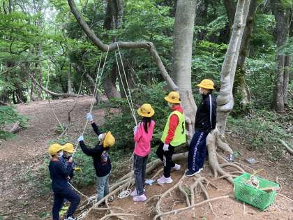 森の木を利用して、ターザンロープやブランコ等を作り、子供たちは自然の中での体験を楽しんでいます。