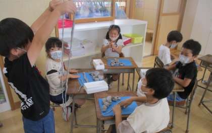 どんどん長くなったひもを友達に見せたり、ひもからイメージを広げたり、楽しそうな子供たちでした。