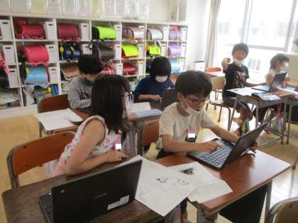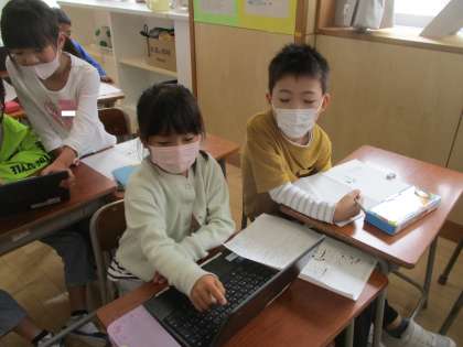 と知らない言葉も出ているので、クロムブックを使って意味調べをしながら取り組んでいます。