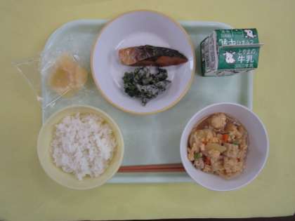 ごはん 牛乳 ふくらぎの照焼き よごし 卵とじ 冷凍りんご
