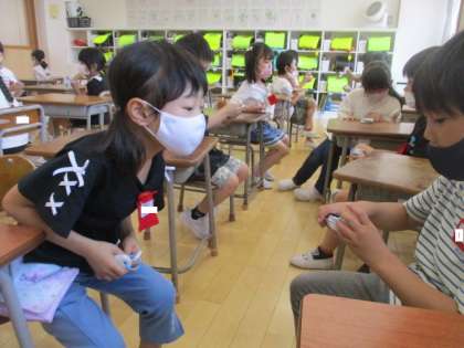 ペアで、カードから計算問題を出し合ったり、どちらの答えが大きいかを比べたりします。出し合って、楽しみながら計算している子供たちでした。