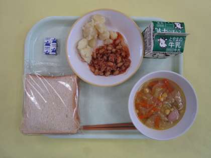食パン 牛乳 チリコンカン キャベツスープ ポケットチーズ こふきいも