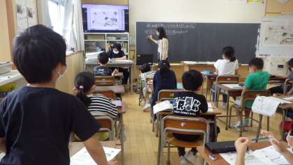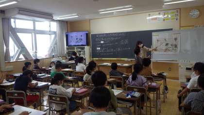 絵地図を見ながら、いろいろな長さを求めました。「道のり」と「きょり」の違いや、1000mは「1km」と表せることを学びました。