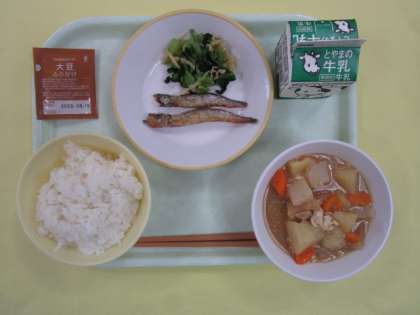 ごはん 牛乳 ししゃものから揚げ はりはり和え 鶏肉とじゃがいものごま煮 大豆のふりかけ