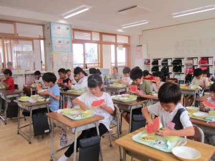 今日の給食には、大きなスイカが。「がんばったみんなへのご褒美みたいだね」と、うれしそうに食べていました。