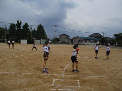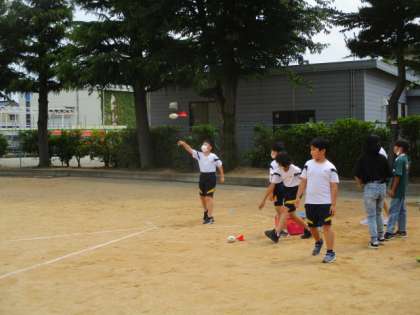 ソフトボール投げの練習をしました。体のどこに重心を持ってくればよいのか、腕の使い方はどうしたらよいのかなど、より遠くに飛ばすためにはどのような工夫が必要なのか考えながら取り組みました。