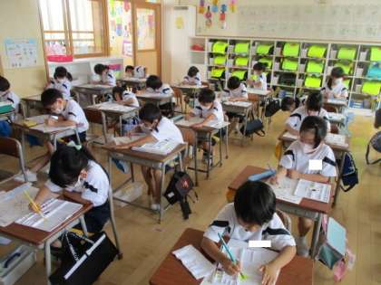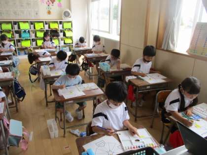 小学校で使う初めての水彩なので、先生の話をよく聞いて活動を進めていました。