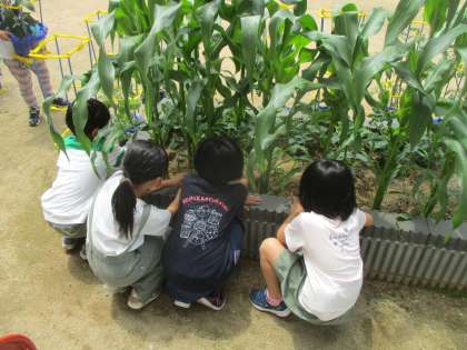 トウモロコシの下に生えている雑草を抜き、風通しをよくしました。 ぐんぐん生長して嬉しい限りです。