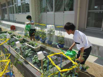 ヘチマの種から芽が出て、少しずつ大きく育っています。水やりをして、愛情を込めてお世話していきます。
