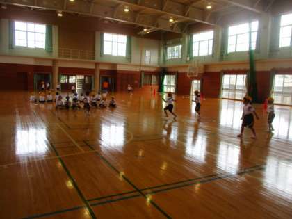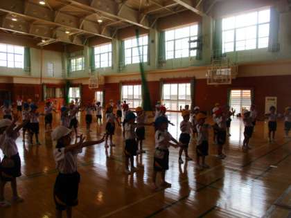 体育科「おにあそび」の学習で、宝運び鬼ごっこをしました。今日は、2組の先生バージョンで「おにのパンツ」の準備体操をしました。