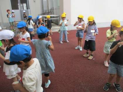 6月27日(月)3時間目、生活科「あつく なったよ」の学習で、シャボン玉遊びをしました。どうしたら大きなシャボン玉ができるのか、考えながら吹きます。