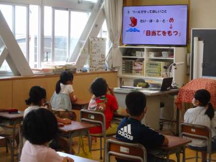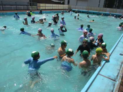 今日はプール開きでした。プールに入る前に「たい・は・ふ・と・め」というルールを確認した後、3限目に入水しました。