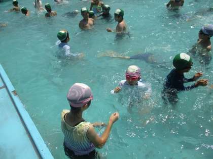 水中じゃんけんや、足の間をくぐり合いっこをして、友達と仲良く関わり合っていました。