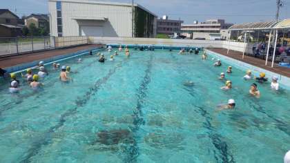 1限の始めにテレビ放送でプール開きがあった後、2年生と一緒にプールに入りました。