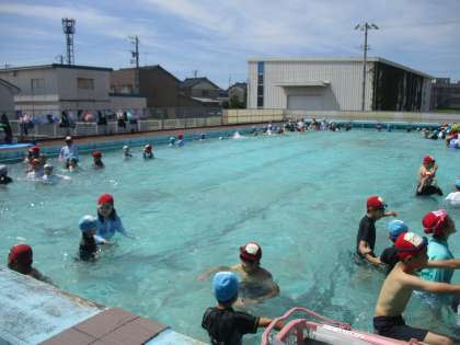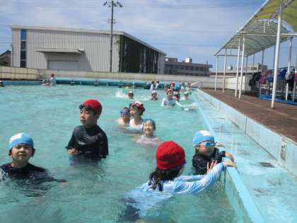 1年生と一緒にプールに入りました。初めてのプールで緊張する1年生に「大丈夫だよ」「一緒に入ろう」と優しく声をかけたり、手を差し出したりしていました。