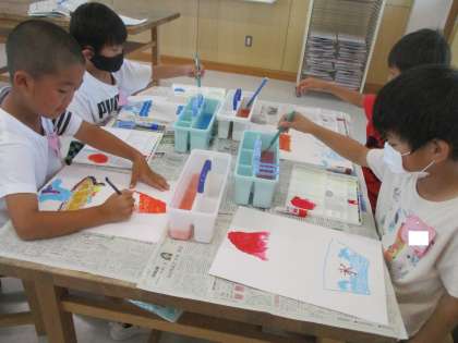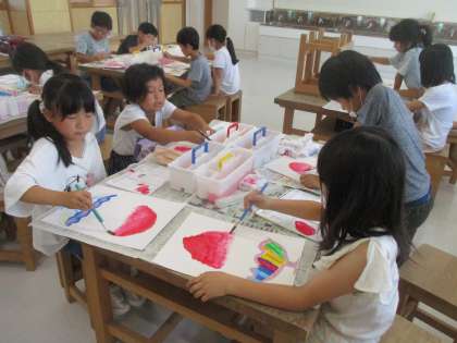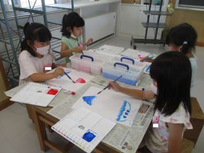 トントンと絵の具の粒を置くような筆遣いをすることで、かき氷のごつごつとした氷の様子が表現できました。
