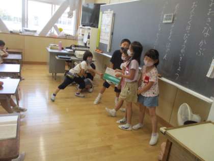 「うんとこしょ、どっこいしょ。」のかけ声に合わせて、ひっぱる動きをしたり、「まごをよんでこよう!」と、登場人物の気持ちになってせりふを言ったりと、それぞれの団で工夫する姿が見られました。