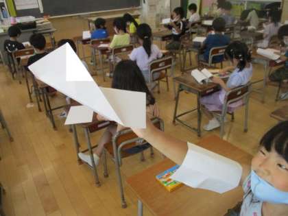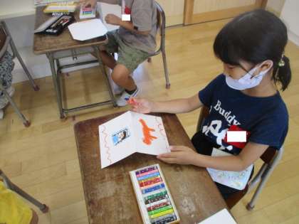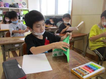 図画工作科「おってたてたら」の学習で、紙を立てて想像を広げました。生き物や建物に見立て、さらに折ったり、クレヨンで絵を描き加えたりして楽しみました。次の時間には、できたものを「おってたてたらタウン」に並べ、みんなで楽しみたいと思います。