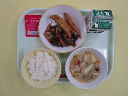 ごはん 牛乳 ワカサギのフリッター もずくのチャプチェ 具だくさんみそ汁 しそかつおふりかけ