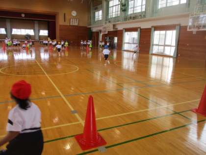コーンの周りを素早く駆け抜ける子供の姿が見られました。これからも楽しみながら、活動を進めていきます。