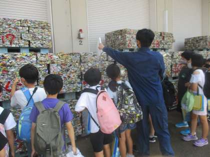 子供たちが見たいと思っていた、プレスされた缶の山を見せてもらいました。