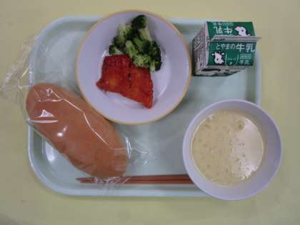 コッペパン 牛乳 魚のチリソースかけ ゆでブロッコリー コーンポタージュ