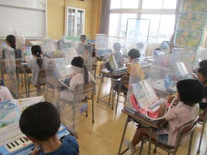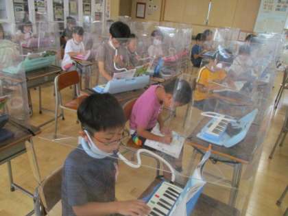 ぷっかりくじらの曲のぷかぷかした様子を表そうと、音の高低を付けるなど思い思いの旋律をつくっていました。