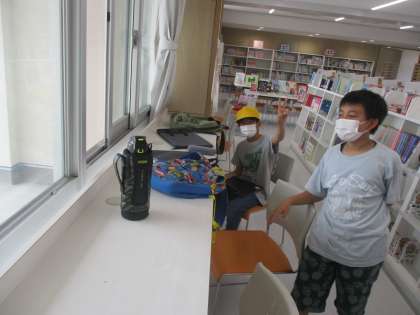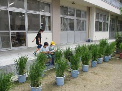夏休みに入り早速、子供たちは図書室で学習したり、バケツ稲の様子を観察しに来たりしています。
