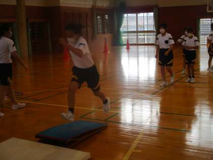 走り幅跳びでは、1,2,3!のかけ声を意識してリズムよく助走を行いました。