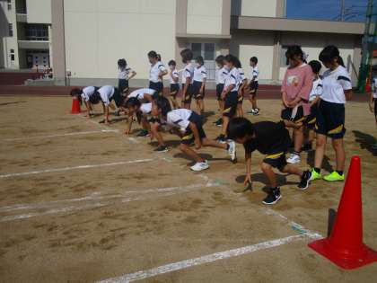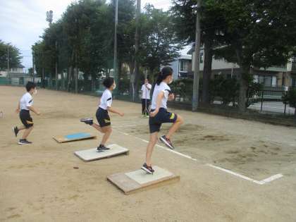 走り幅跳びの助走を長くして走ったり、50m走のスタートダッシュの練習をしたりしました。「1・2・3!」と声を出しながら、友達とリズムを確認し合う姿が見られました。