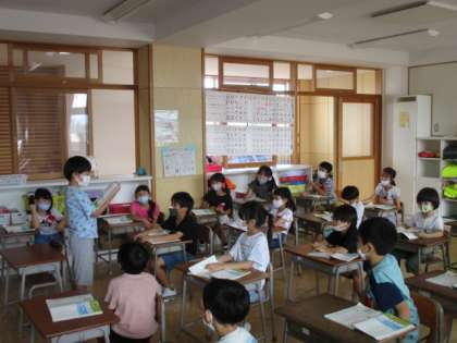 国語科「こえに だして よもう」の学習では、「いちねんせいのうた」の詩を音読しました。青くて広い空に指を突き出して、一を書く様子を想像しながら、音読しました。