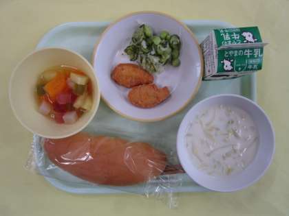9月9日(金)今日の給食 公開日 2022/09/09 更新日 2022/09/09 きょうの給食 こんだて コッペパン 牛乳 チキンナゲット えごまドレッシングサラダ 白いんげん豆のクリームスープ フルーツカクテル