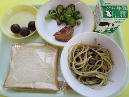 こんだて 食パン(減) 牛乳 照焼きチキン ベーコンとひじきの和風スパゲッティ 巨峰