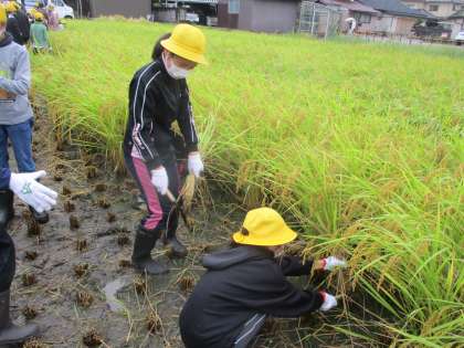 稲刈り体験では、稲の刈り方や稲のまとめ方等、さまざまなことを教えていただきました。