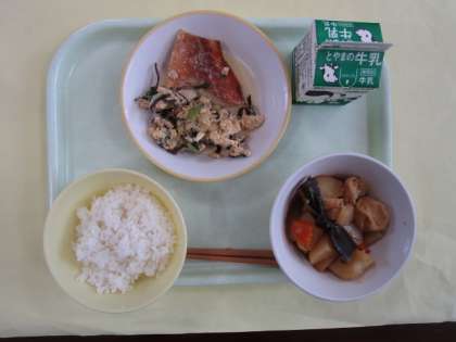こんだて ご飯 牛乳 赤魚の塩焼き 炊き合わせ 卵ときくらげの炒め物