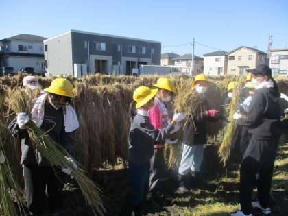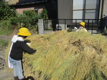 子供たちは3箇所に分かれて、はさがけしてある稲を運んだり、コンバインから出てきた藁を束ねたり、稲にまだ付いている米を鎌でとったりしました。