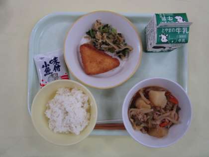 こんだて ごはん 牛乳 はんぺんフライ はりはり和え 肉じゃが 味付け小魚