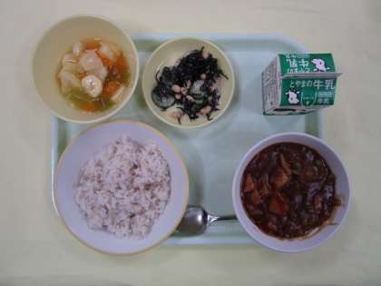 こんだて 麦ご飯 牛乳 食べキリンハヤシ 大豆とひじきのサラダ フルーツゼリーミックス