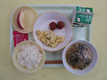 こんだて ご飯 牛乳 ミートボール りんご チーズおさつ 春雨スープ しそかつおふりかけ