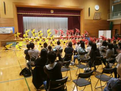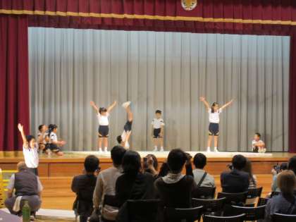 学年目標「4あわせのクローバー 〜進んで・チャレンジ・最後まで・思いやり」を目指し、マット・跳び箱、ダンス、リボン、旗の4つのチームで楽しく発表することができました。