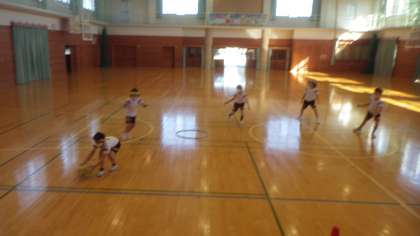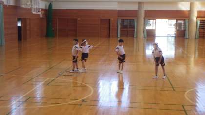 体育科ではキックベースボールをしています。どうやったら点数を取れるのか、どうやったらうまく守れるのかを考えながら、協力して取り組んでいます。
