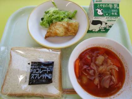 こんだて 食パン 牛乳 魚のえごま揚げ そえ野菜 豆とベーコンのトマト煮 チョコレートクリーム