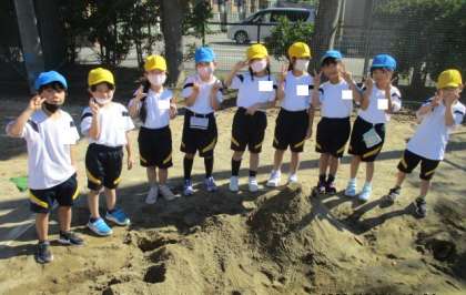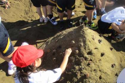 どんどん積んで大きな砂山をつくったり、石や枯れ葉、松ぼっくり等を使って食べ物に見立てたり、飾ったりする姿が見られました。