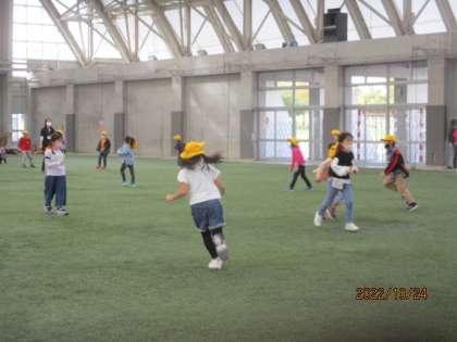 午前中はあいにくのお天気でしたが、どんぐりや落ち葉を拾った後、屋内グラウンドで体を動かしました。