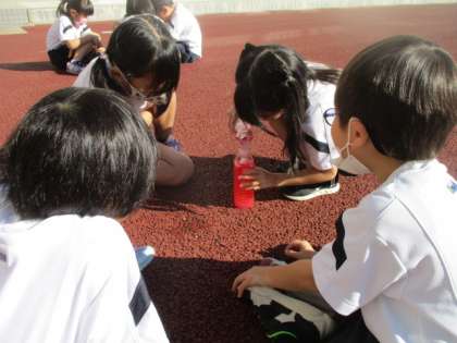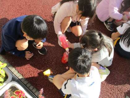 「『あ』の方が多いと思う!」「じゃあ、やってみよう!」と、子供たちは色水でいっぱいのペットボトルから、順番に仲良く、そして慎重に移しかえていました。