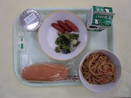 こんだて コッペパン 牛乳 あらびきウインナー こんにゃくサラダ いか焼きそば ヨーグルト