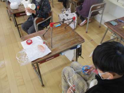 生活科「あきとあそぼう」の学習で、秋のおもちゃづくりをしました。