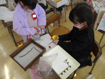 遠足で拾ってきたどんぐりや落ち葉を飾りに使ったり、迷路のコースづくりに集めてきた木の枝を使ったり、それぞれが思い描いた秋のおもちゃを、楽しくつくる姿が見られました。