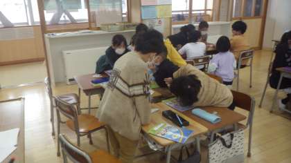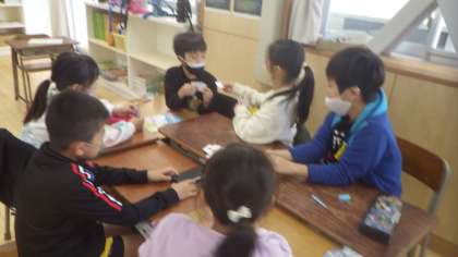 「A blue circle please」 「Here you are」等の英語を使って、マッチングゲームを行いました。子供たちは、楽しみながら色や形、◯◯がほしいという表現に慣れ親しみました。