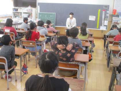 今日は市立図書館奥田北分館の司書の方の、本の読み聞かせがありました。